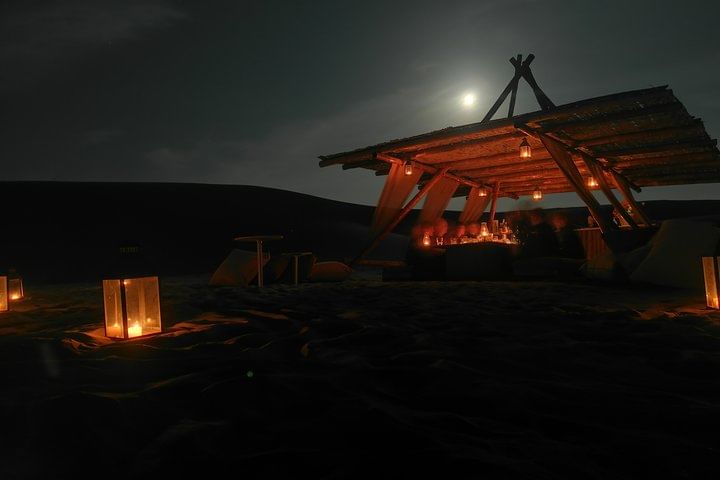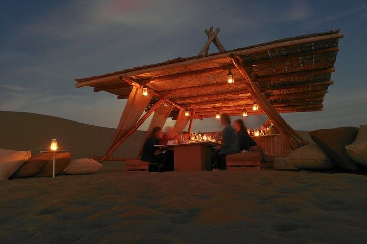 Después de una sesión informativa, suba a bordo de un buggy para explorar las dunas de Ica durante 25 minutos y vivir una emocionante aventura llena de adrenalina. Después de navegar por las subidas y bajadas del desierto, llega a una de las dunas más altas, donde podrás admirar el paisaje y tomar impresionantes fotos. Además, prueba a practicar sandboard en este increíble lugar. Más tarde, disfrute de la puesta de sol desde un lugar privilegiado mientras saborea champán frío, aperitivos, fruta y bebidas hasta el anochecer. Si las condiciones climáticas lo permiten, maravíllese con un magnífico cielo estrellado. Al final de la experiencia, regresa a la base.